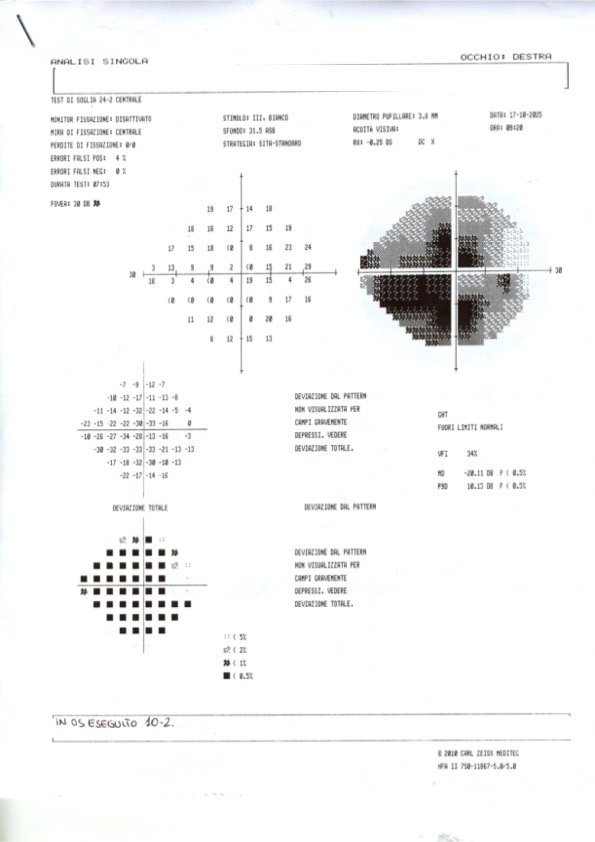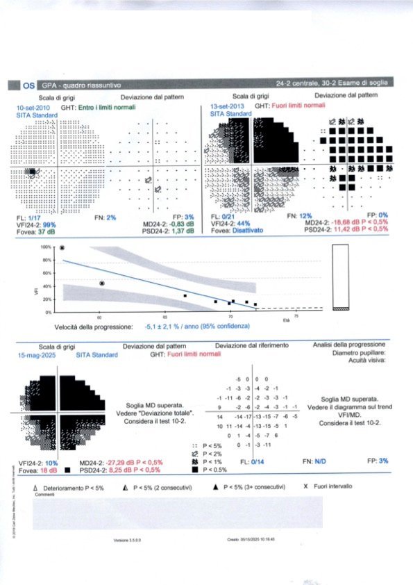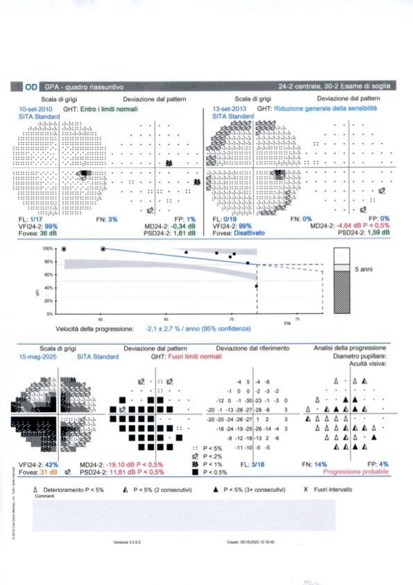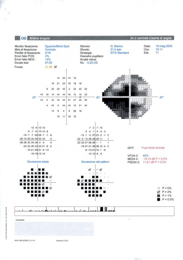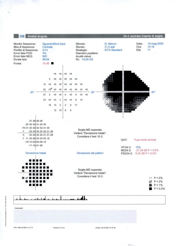 Il paziente riferisce di aver eseguito il campo visivo circa una settimana fa. Non lo ha inviato immediatamente poiché, avendo in programma la visita pre-operatoria in ospedale, sperava di poter comunicare contestualmente anche la data dell’intervento, che tuttavia resta ancora da definire, pur essendo già inserito in lista con priorità.